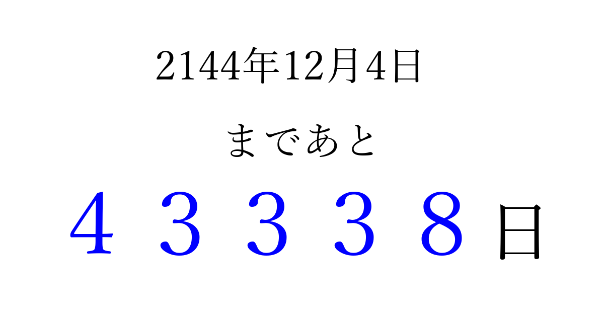 2144年12月4日(金)まで あと 99999 日です 追加すると、トップページからすぐ選べるようになります ※2026/04/09現在の結果です。 最新の状態に更新する ↓シェアして、タイムライン上にカウントダウンを表示しよう!↓ 📤 この結果を共有する Tweet シェア Threads Bluesky 別の日付でカウントダウン 2144年12月のカレンダー このページをブックマークに追加すると、いつでもカウントダウンを確認できます。 (PC: Ctrl+D / Mac: ⌘+D) hitome-notes.comでは以下のページも運営しています。 指定日と期間から日付を計算 | ガチャ確率計算・シミュレーション | プライバシー・ポリシー 運営者:Avocado