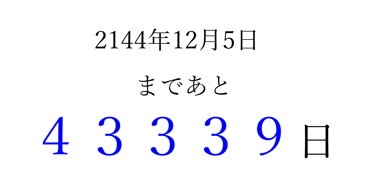 2144年12月5日(土)まで あと 99999 日です 追加すると、トップページからすぐ選べるようになります ※2026/04/09現在の結果です。 最新の状態に更新する ↓シェアして、タイムライン上にカウントダウンを表示しよう!↓ 📤 この結果を共有する Tweet シェア Threads Bluesky 別の日付でカウントダウン 2144年12月のカレンダー このページをブックマークに追加すると、いつでもカウントダウンを確認できます。 (PC: Ctrl+D / Mac: ⌘+D) hitome-notes.comでは以下のページも運営しています。 指定日と期間から日付を計算 | ガチャ確率計算・シミュレーション | プライバシー・ポリシー 運営者:Avocado