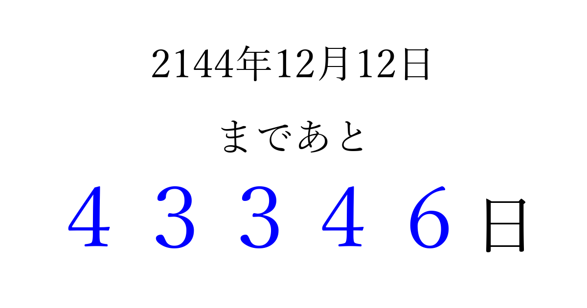 2144年12月12日(土)まで あと 99999 日です 追加すると、トップページからすぐ選べるようになります ※2026/04/09現在の結果です。 最新の状態に更新する ↓シェアして、タイムライン上にカウントダウンを表示しよう!↓ 📤 この結果を共有する Tweet シェア Threads Bluesky 別の日付でカウントダウン 2144年12月のカレンダー このページをブックマークに追加すると、いつでもカウントダウンを確認できます。 (PC: Ctrl+D / Mac: ⌘+D) hitome-notes.comでは以下のページも運営しています。 指定日と期間から日付を計算 | ガチャ確率計算・シミュレーション | プライバシー・ポリシー 運営者:Avocado