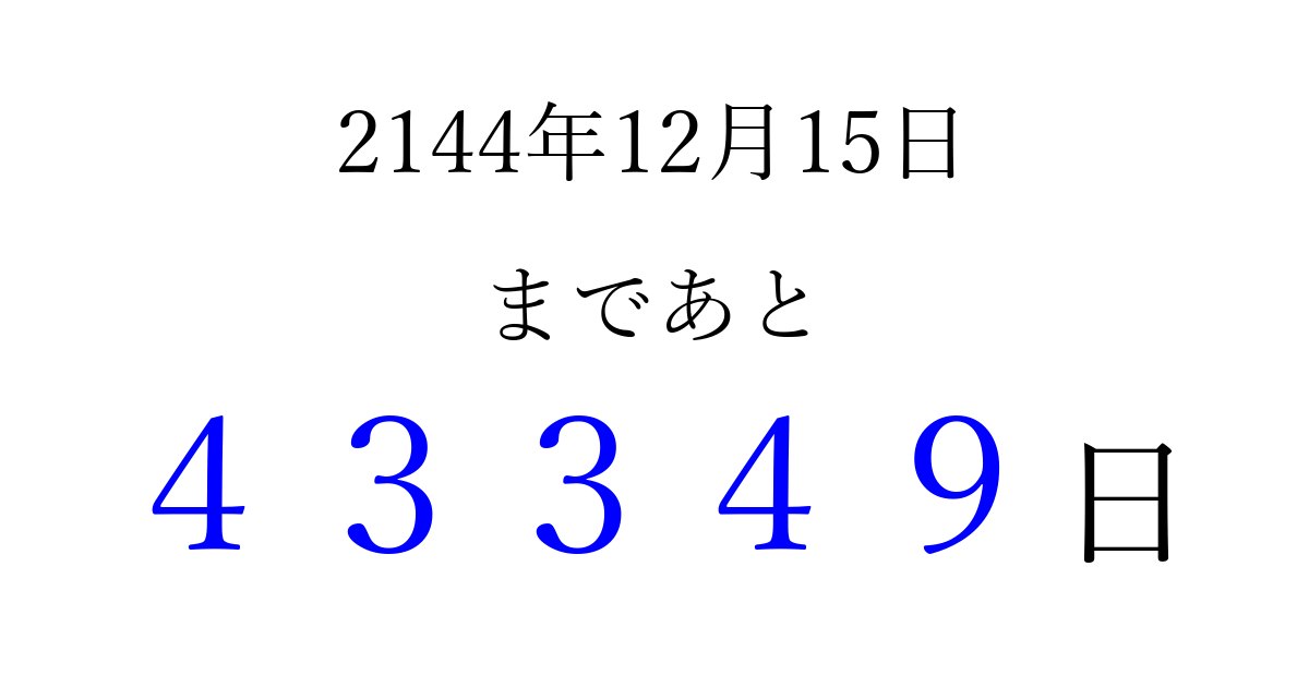 2144年12月15日(火)まで あと 99999 日です 追加すると、トップページからすぐ選べるようになります ※2026/04/09現在の結果です。 最新の状態に更新する ↓シェアして、タイムライン上にカウントダウンを表示しよう!↓ 📤 この結果を共有する Tweet シェア Threads Bluesky 別の日付でカウントダウン 2144年12月のカレンダー このページをブックマークに追加すると、いつでもカウントダウンを確認できます。 (PC: Ctrl+D / Mac: ⌘+D) hitome-notes.comでは以下のページも運営しています。 指定日と期間から日付を計算 | ガチャ確率計算・シミュレーション | プライバシー・ポリシー 運営者:Avocado