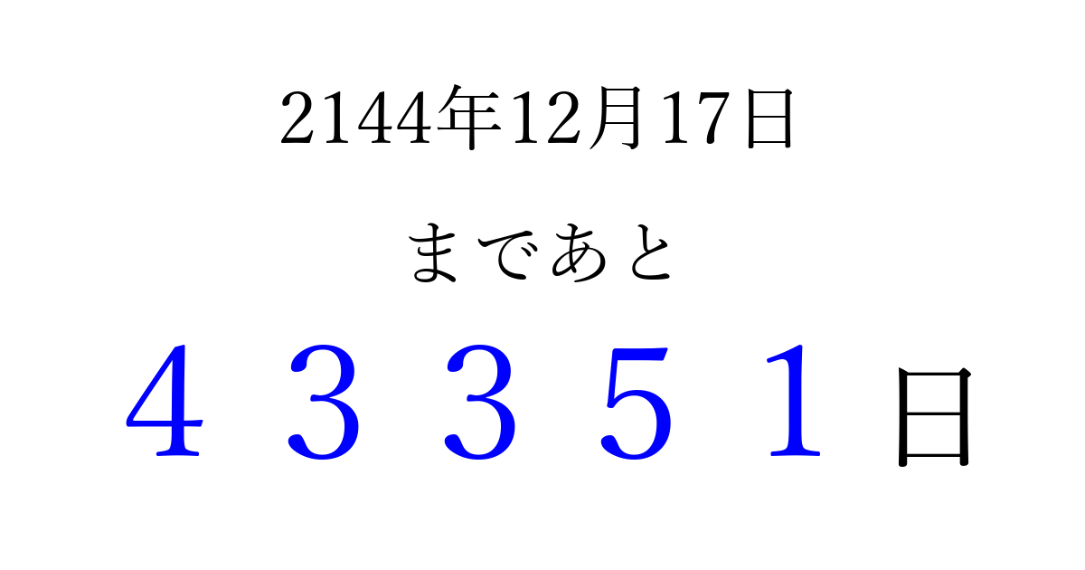 2144年12月17日(木)まで あと 99999 日です 追加すると、トップページからすぐ選べるようになります ※2026/04/09現在の結果です。 最新の状態に更新する ↓シェアして、タイムライン上にカウントダウンを表示しよう!↓ 📤 この結果を共有する Tweet シェア Threads Bluesky 別の日付でカウントダウン 2144年12月のカレンダー このページをブックマークに追加すると、いつでもカウントダウンを確認できます。 (PC: Ctrl+D / Mac: ⌘+D) hitome-notes.comでは以下のページも運営しています。 指定日と期間から日付を計算 | ガチャ確率計算・シミュレーション | プライバシー・ポリシー 運営者:Avocado