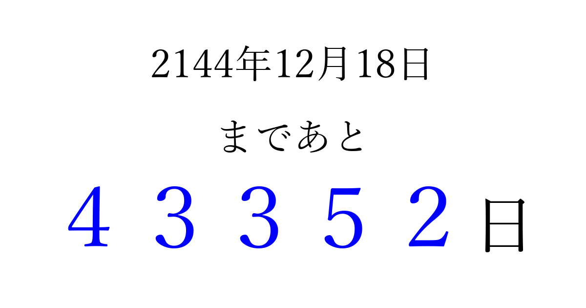 2144年12月18日(金)まで あと 99999 日です 追加すると、トップページからすぐ選べるようになります ※2026/04/09現在の結果です。 最新の状態に更新する ↓シェアして、タイムライン上にカウントダウンを表示しよう!↓ 📤 この結果を共有する Tweet シェア Threads Bluesky 別の日付でカウントダウン 2144年12月のカレンダー このページをブックマークに追加すると、いつでもカウントダウンを確認できます。 (PC: Ctrl+D / Mac: ⌘+D) hitome-notes.comでは以下のページも運営しています。 指定日と期間から日付を計算 | ガチャ確率計算・シミュレーション | プライバシー・ポリシー 運営者:Avocado