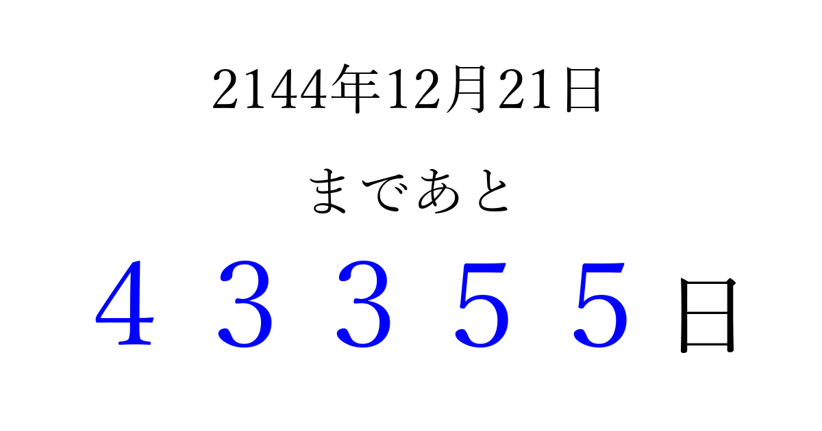 2144年12月21日(月)まで あと 99999 日です 追加すると、トップページからすぐ選べるようになります ※2026/04/09現在の結果です。 最新の状態に更新する ↓シェアして、タイムライン上にカウントダウンを表示しよう!↓ 📤 この結果を共有する Tweet シェア Threads Bluesky 別の日付でカウントダウン 2144年12月のカレンダー このページをブックマークに追加すると、いつでもカウントダウンを確認できます。 (PC: Ctrl+D / Mac: ⌘+D) hitome-notes.comでは以下のページも運営しています。 指定日と期間から日付を計算 | ガチャ確率計算・シミュレーション | プライバシー・ポリシー 運営者:Avocado