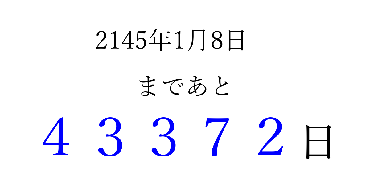 2145年1月8日(金)まで あと 99999 日です 追加すると、トップページからすぐ選べるようになります ※2026/04/10現在の結果です。 最新の状態に更新する ↓シェアして、タイムライン上にカウントダウンを表示しよう!↓ 📤 この結果を共有する Tweet シェア Threads Bluesky 別の日付でカウントダウン 2145年1月のカレンダー このページをブックマークに追加すると、いつでもカウントダウンを確認できます。 (PC: Ctrl+D / Mac: ⌘+D) hitome-notes.comでは以下のページも運営しています。 指定日と期間から日付を計算 | ガチャ確率計算・シミュレーション | プライバシー・ポリシー 運営者:Avocado