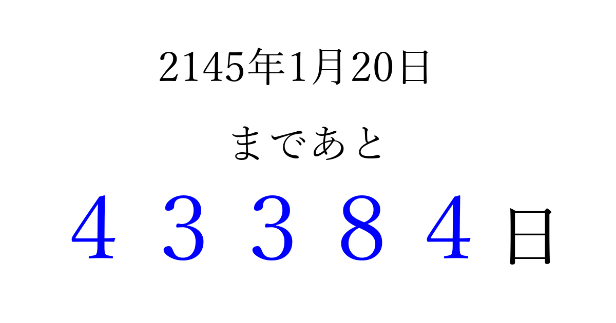 2145年1月20日(水)まで あと 99999 日です 追加すると、トップページからすぐ選べるようになります ※2026/04/10現在の結果です。 最新の状態に更新する ↓シェアして、タイムライン上にカウントダウンを表示しよう!↓ 📤 この結果を共有する Tweet シェア Threads Bluesky 別の日付でカウントダウン 2145年1月のカレンダー このページをブックマークに追加すると、いつでもカウントダウンを確認できます。 (PC: Ctrl+D / Mac: ⌘+D) hitome-notes.comでは以下のページも運営しています。 指定日と期間から日付を計算 | ガチャ確率計算・シミュレーション | プライバシー・ポリシー 運営者:Avocado