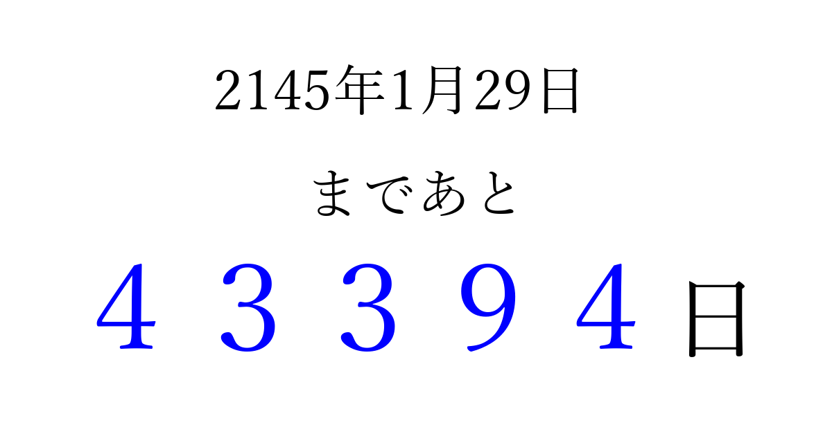 2145年1月29日(金)まで あと 99999 日です 追加すると、トップページからすぐ選べるようになります ※2026/04/09現在の結果です。 最新の状態に更新する ↓シェアして、タイムライン上にカウントダウンを表示しよう!↓ 📤 この結果を共有する Tweet シェア Threads Bluesky 別の日付でカウントダウン 2145年1月のカレンダー このページをブックマークに追加すると、いつでもカウントダウンを確認できます。 (PC: Ctrl+D / Mac: ⌘+D) hitome-notes.comでは以下のページも運営しています。 指定日と期間から日付を計算 | ガチャ確率計算・シミュレーション | プライバシー・ポリシー 運営者:Avocado