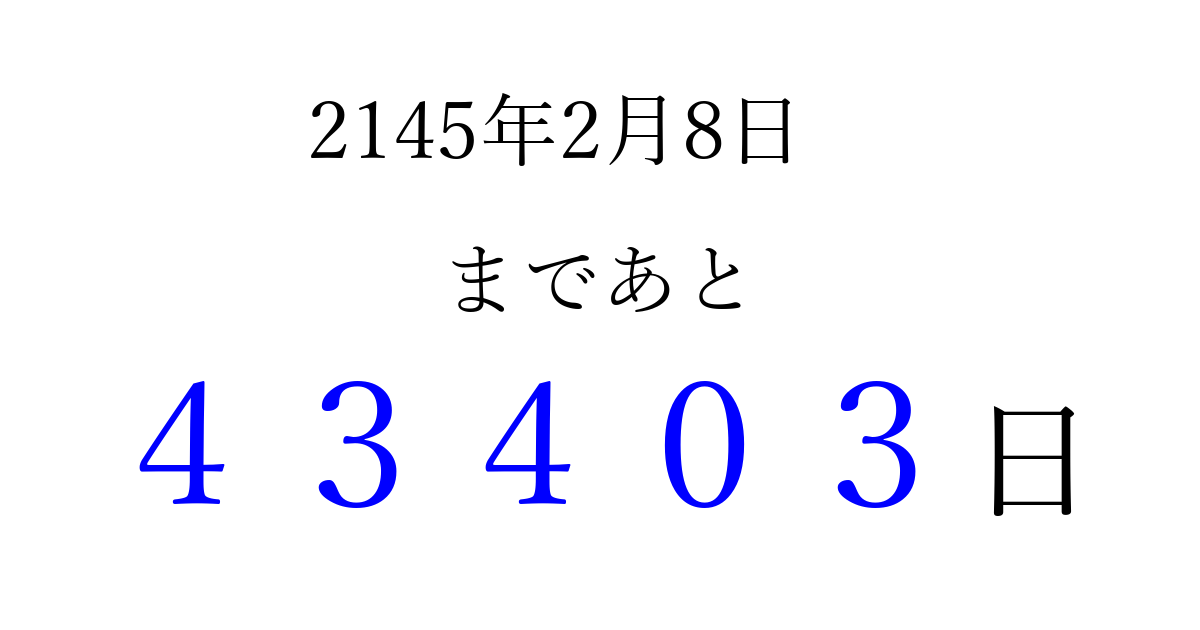 2145年2月8日(月)まで あと 99999 日です 追加すると、トップページからすぐ選べるようになります ※2026/04/10現在の結果です。 最新の状態に更新する ↓シェアして、タイムライン上にカウントダウンを表示しよう!↓ 📤 この結果を共有する Tweet シェア Threads Bluesky 別の日付でカウントダウン 2145年2月のカレンダー このページをブックマークに追加すると、いつでもカウントダウンを確認できます。 (PC: Ctrl+D / Mac: ⌘+D) hitome-notes.comでは以下のページも運営しています。 指定日と期間から日付を計算 | ガチャ確率計算・シミュレーション | プライバシー・ポリシー 運営者:Avocado