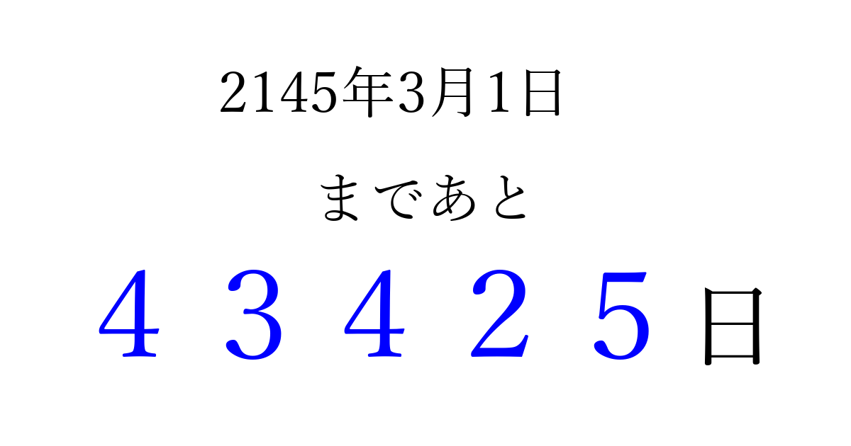 2145年3月1日(月)まで あと 99999 日です 追加すると、トップページからすぐ選べるようになります ※2026/04/09現在の結果です。 最新の状態に更新する ↓シェアして、タイムライン上にカウントダウンを表示しよう!↓ 📤 この結果を共有する Tweet シェア Threads Bluesky 別の日付でカウントダウン 2145年3月のカレンダー このページをブックマークに追加すると、いつでもカウントダウンを確認できます。 (PC: Ctrl+D / Mac: ⌘+D) hitome-notes.comでは以下のページも運営しています。 指定日と期間から日付を計算 | ガチャ確率計算・シミュレーション | プライバシー・ポリシー 運営者:Avocado