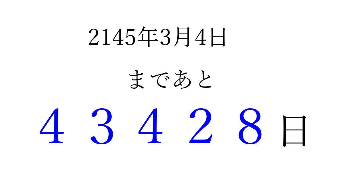2145年3月4日(木)まで あと 99999 日です 追加すると、トップページからすぐ選べるようになります ※2026/04/09現在の結果です。 最新の状態に更新する ↓シェアして、タイムライン上にカウントダウンを表示しよう!↓ 📤 この結果を共有する Tweet シェア Threads Bluesky 別の日付でカウントダウン 2145年3月のカレンダー このページをブックマークに追加すると、いつでもカウントダウンを確認できます。 (PC: Ctrl+D / Mac: ⌘+D) hitome-notes.comでは以下のページも運営しています。 指定日と期間から日付を計算 | ガチャ確率計算・シミュレーション | プライバシー・ポリシー 運営者:Avocado