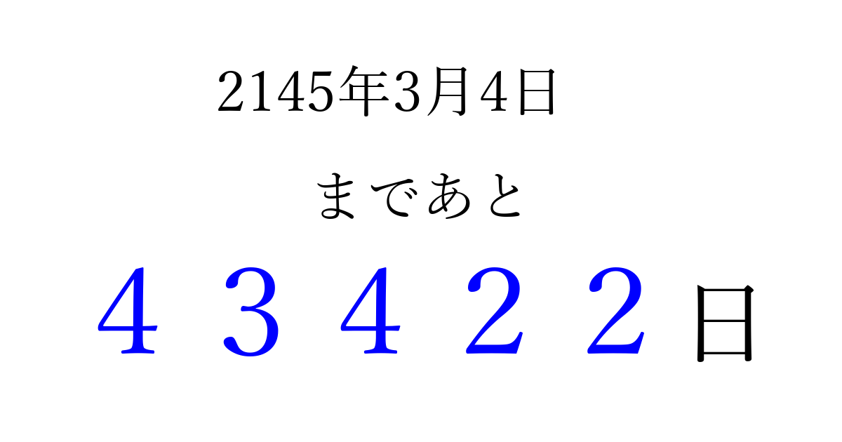 2145年3月4日(木)まで あと 99999 日です 追加すると、トップページからすぐ選べるようになります ※2026/04/15現在の結果です。 最新の状態に更新する ↓シェアして、タイムライン上にカウントダウンを表示しよう!↓ 📤 この結果を共有する Tweet シェア Threads Bluesky 別の日付でカウントダウン 2145年3月のカレンダー このページをブックマークに追加すると、いつでもカウントダウンを確認できます。 (PC: Ctrl+D / Mac: ⌘+D) hitome-notes.comでは以下のページも運営しています。 指定日と期間から日付を計算 | ガチャ確率計算・シミュレーション | プライバシー・ポリシー 運営者:Avocado
