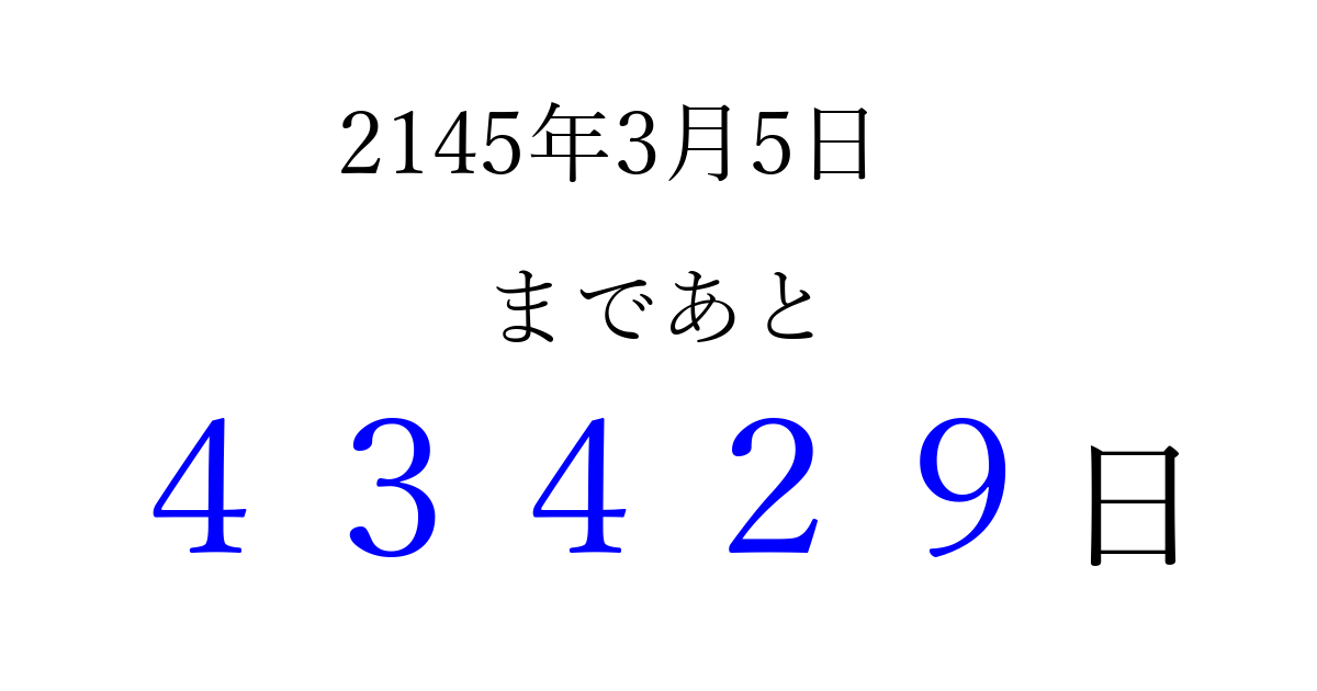 2145年3月5日(金)まで あと 99999 日です 追加すると、トップページからすぐ選べるようになります ※2026/04/09現在の結果です。 最新の状態に更新する ↓シェアして、タイムライン上にカウントダウンを表示しよう!↓ 📤 この結果を共有する Tweet シェア Threads Bluesky 別の日付でカウントダウン 2145年3月のカレンダー このページをブックマークに追加すると、いつでもカウントダウンを確認できます。 (PC: Ctrl+D / Mac: ⌘+D) hitome-notes.comでは以下のページも運営しています。 指定日と期間から日付を計算 | ガチャ確率計算・シミュレーション | プライバシー・ポリシー 運営者:Avocado