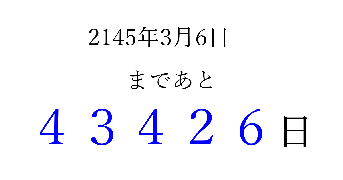 2145年3月6日(土)まで あと 99999 日です 追加すると、トップページからすぐ選べるようになります ※2026/04/13現在の結果です。 最新の状態に更新する ↓シェアして、タイムライン上にカウントダウンを表示しよう!↓ 📤 この結果を共有する Tweet シェア Threads Bluesky 別の日付でカウントダウン 2145年3月のカレンダー このページをブックマークに追加すると、いつでもカウントダウンを確認できます。 (PC: Ctrl+D / Mac: ⌘+D) hitome-notes.comでは以下のページも運営しています。 指定日と期間から日付を計算 | ガチャ確率計算・シミュレーション | プライバシー・ポリシー 運営者:Avocado