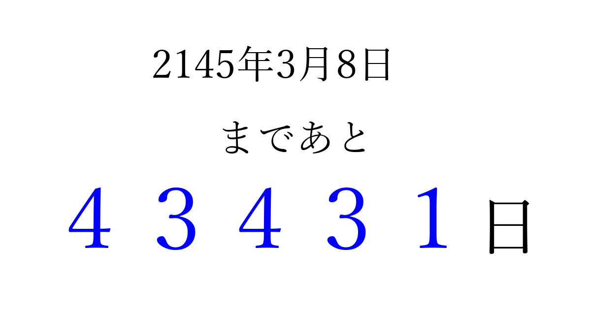 2145年3月8日(月)まで あと 99999 日です 追加すると、トップページからすぐ選べるようになります ※2026/04/10現在の結果です。 最新の状態に更新する ↓シェアして、タイムライン上にカウントダウンを表示しよう!↓ 📤 この結果を共有する Tweet シェア Threads Bluesky 別の日付でカウントダウン 2145年3月のカレンダー このページをブックマークに追加すると、いつでもカウントダウンを確認できます。 (PC: Ctrl+D / Mac: ⌘+D) hitome-notes.comでは以下のページも運営しています。 指定日と期間から日付を計算 | ガチャ確率計算・シミュレーション | プライバシー・ポリシー 運営者:Avocado