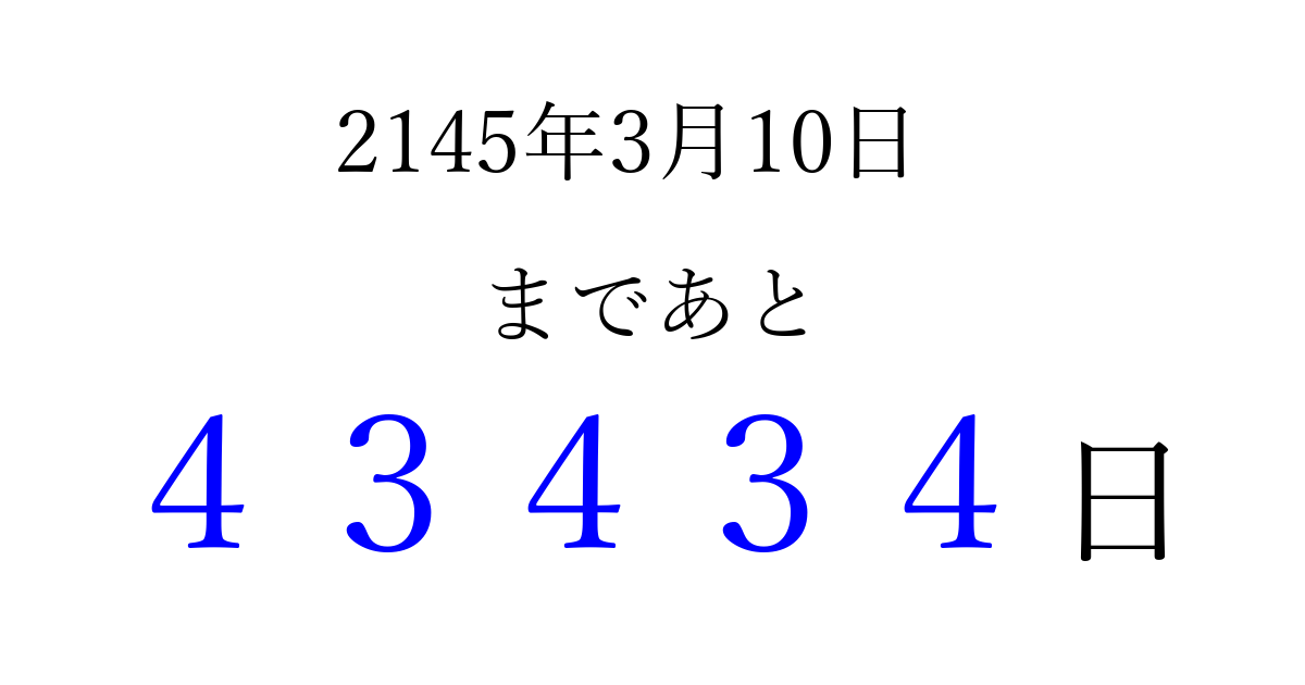 2145年3月10日(水)まで あと 99999 日です 追加すると、トップページからすぐ選べるようになります ※2026/04/09現在の結果です。 最新の状態に更新する ↓シェアして、タイムライン上にカウントダウンを表示しよう!↓ 📤 この結果を共有する Tweet シェア Threads Bluesky 別の日付でカウントダウン 2145年3月のカレンダー このページをブックマークに追加すると、いつでもカウントダウンを確認できます。 (PC: Ctrl+D / Mac: ⌘+D) hitome-notes.comでは以下のページも運営しています。 指定日と期間から日付を計算 | ガチャ確率計算・シミュレーション | プライバシー・ポリシー 運営者:Avocado