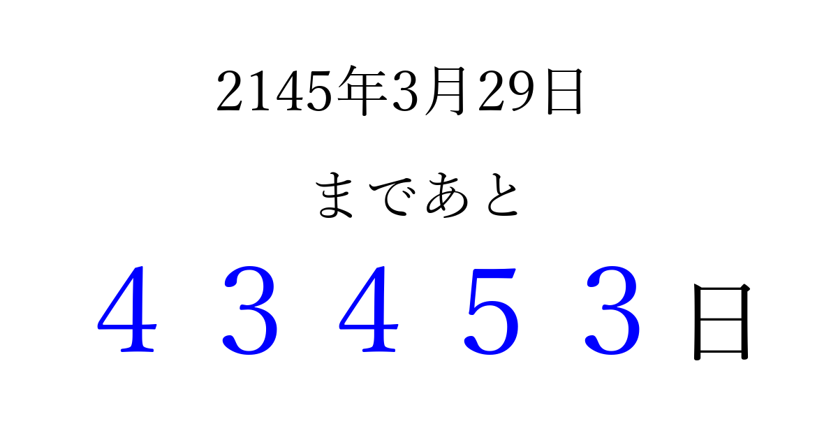 2145年3月29日(月)まで あと 99999 日です 追加すると、トップページからすぐ選べるようになります ※2026/04/09現在の結果です。 最新の状態に更新する ↓シェアして、タイムライン上にカウントダウンを表示しよう!↓ 📤 この結果を共有する Tweet シェア Threads Bluesky 別の日付でカウントダウン 2145年3月のカレンダー このページをブックマークに追加すると、いつでもカウントダウンを確認できます。 (PC: Ctrl+D / Mac: ⌘+D) hitome-notes.comでは以下のページも運営しています。 指定日と期間から日付を計算 | ガチャ確率計算・シミュレーション | プライバシー・ポリシー 運営者:Avocado