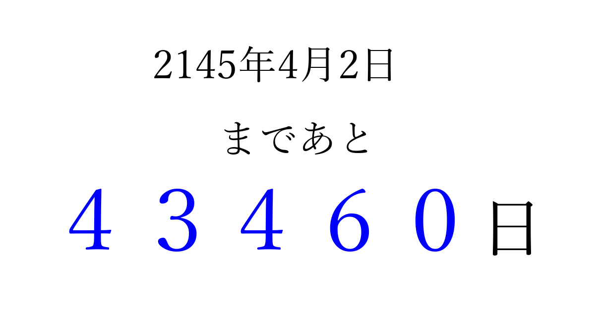 2145年4月2日(金)まで あと 99999 日です 追加すると、トップページからすぐ選べるようになります ※2026/04/06現在の結果です。 最新の状態に更新する ↓シェアして、タイムライン上にカウントダウンを表示しよう!↓ 📤 この結果を共有する Tweet シェア Threads Bluesky 別の日付でカウントダウン 2145年4月のカレンダー このページをブックマークに追加すると、いつでもカウントダウンを確認できます。 (PC: Ctrl+D / Mac: ⌘+D) hitome-notes.comでは以下のページも運営しています。 指定日と期間から日付を計算 | ガチャ確率計算・シミュレーション | プライバシー・ポリシー 運営者:Avocado