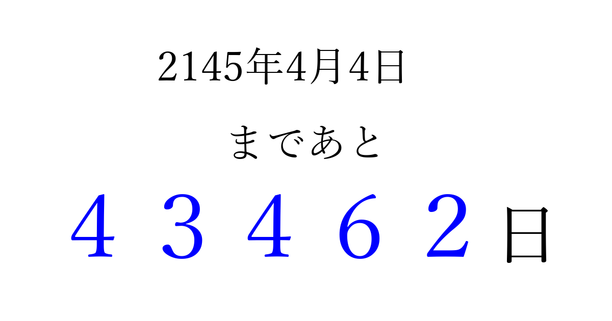 2145年4月4日(日)まで あと 99999 日です 追加すると、トップページからすぐ選べるようになります ※2026/04/06現在の結果です。 最新の状態に更新する ↓シェアして、タイムライン上にカウントダウンを表示しよう!↓ 📤 この結果を共有する Tweet シェア Threads Bluesky 別の日付でカウントダウン 2145年4月のカレンダー このページをブックマークに追加すると、いつでもカウントダウンを確認できます。 (PC: Ctrl+D / Mac: ⌘+D) hitome-notes.comでは以下のページも運営しています。 指定日と期間から日付を計算 | ガチャ確率計算・シミュレーション | プライバシー・ポリシー 運営者:Avocado