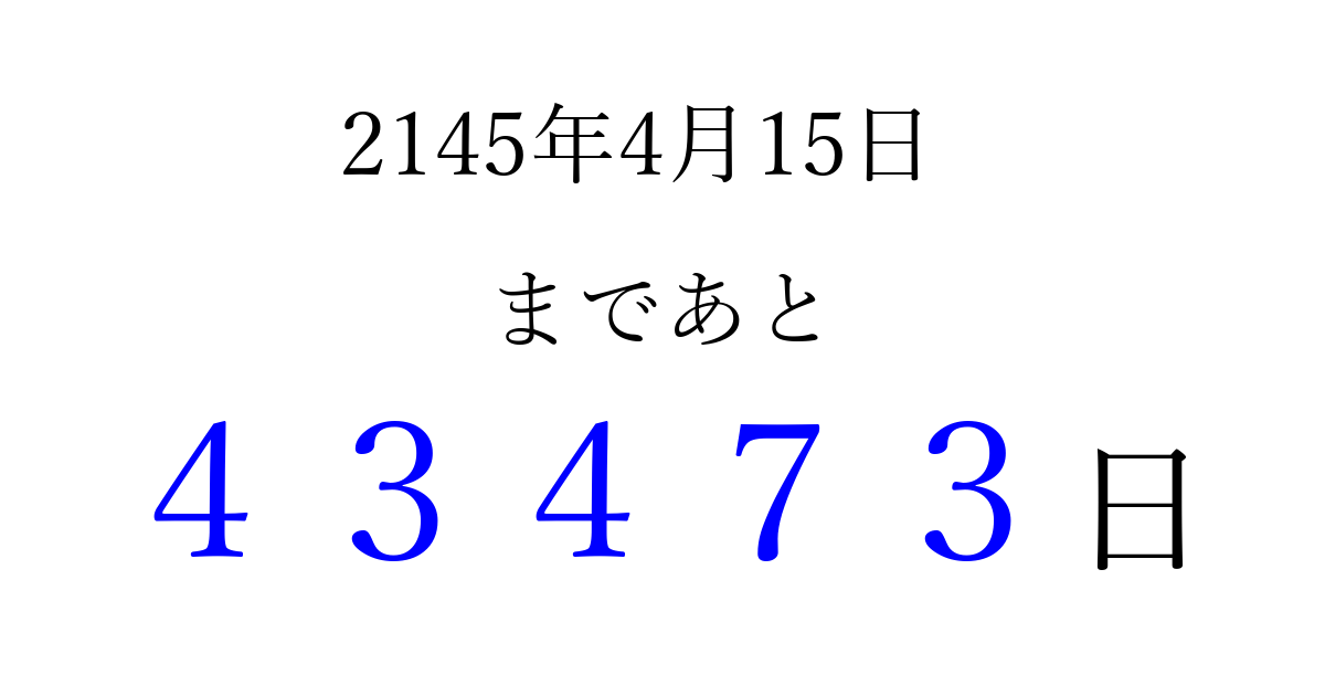 2145年4月15日(木)まで あと 99999 日です 追加すると、トップページからすぐ選べるようになります ※2026/04/06現在の結果です。 最新の状態に更新する ↓シェアして、タイムライン上にカウントダウンを表示しよう!↓ 📤 この結果を共有する Tweet シェア Threads Bluesky 別の日付でカウントダウン 2145年4月のカレンダー このページをブックマークに追加すると、いつでもカウントダウンを確認できます。 (PC: Ctrl+D / Mac: ⌘+D) hitome-notes.comでは以下のページも運営しています。 指定日と期間から日付を計算 | ガチャ確率計算・シミュレーション | プライバシー・ポリシー 運営者:Avocado