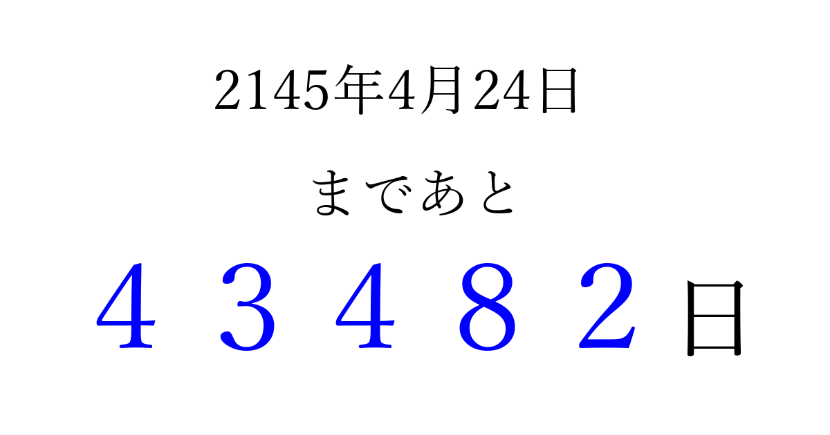 2145年4月24日(土)まで あと 99999 日です 追加すると、トップページからすぐ選べるようになります ※2026/04/06現在の結果です。 最新の状態に更新する ↓シェアして、タイムライン上にカウントダウンを表示しよう!↓ 📤 この結果を共有する Tweet シェア Threads Bluesky 別の日付でカウントダウン 2145年4月のカレンダー このページをブックマークに追加すると、いつでもカウントダウンを確認できます。 (PC: Ctrl+D / Mac: ⌘+D) hitome-notes.comでは以下のページも運営しています。 指定日と期間から日付を計算 | ガチャ確率計算・シミュレーション | プライバシー・ポリシー 運営者:Avocado