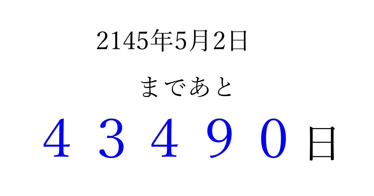 2145年5月2日(日)まで あと 99999 日です 追加すると、トップページからすぐ選べるようになります ※2026/04/06現在の結果です。 最新の状態に更新する ↓シェアして、タイムライン上にカウントダウンを表示しよう!↓ 📤 この結果を共有する Tweet シェア Threads Bluesky 別の日付でカウントダウン 2145年5月のカレンダー このページをブックマークに追加すると、いつでもカウントダウンを確認できます。 (PC: Ctrl+D / Mac: ⌘+D) hitome-notes.comでは以下のページも運営しています。 指定日と期間から日付を計算 | ガチャ確率計算・シミュレーション | プライバシー・ポリシー 運営者:Avocado