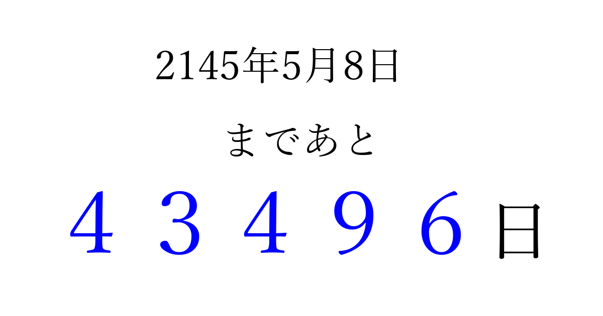 2145年5月8日(土)まで あと 99999 日です 追加すると、トップページからすぐ選べるようになります ※2026/04/06現在の結果です。 最新の状態に更新する ↓シェアして、タイムライン上にカウントダウンを表示しよう!↓ 📤 この結果を共有する Tweet シェア Threads Bluesky 別の日付でカウントダウン 2145年5月のカレンダー このページをブックマークに追加すると、いつでもカウントダウンを確認できます。 (PC: Ctrl+D / Mac: ⌘+D) hitome-notes.comでは以下のページも運営しています。 指定日と期間から日付を計算 | ガチャ確率計算・シミュレーション | プライバシー・ポリシー 運営者:Avocado