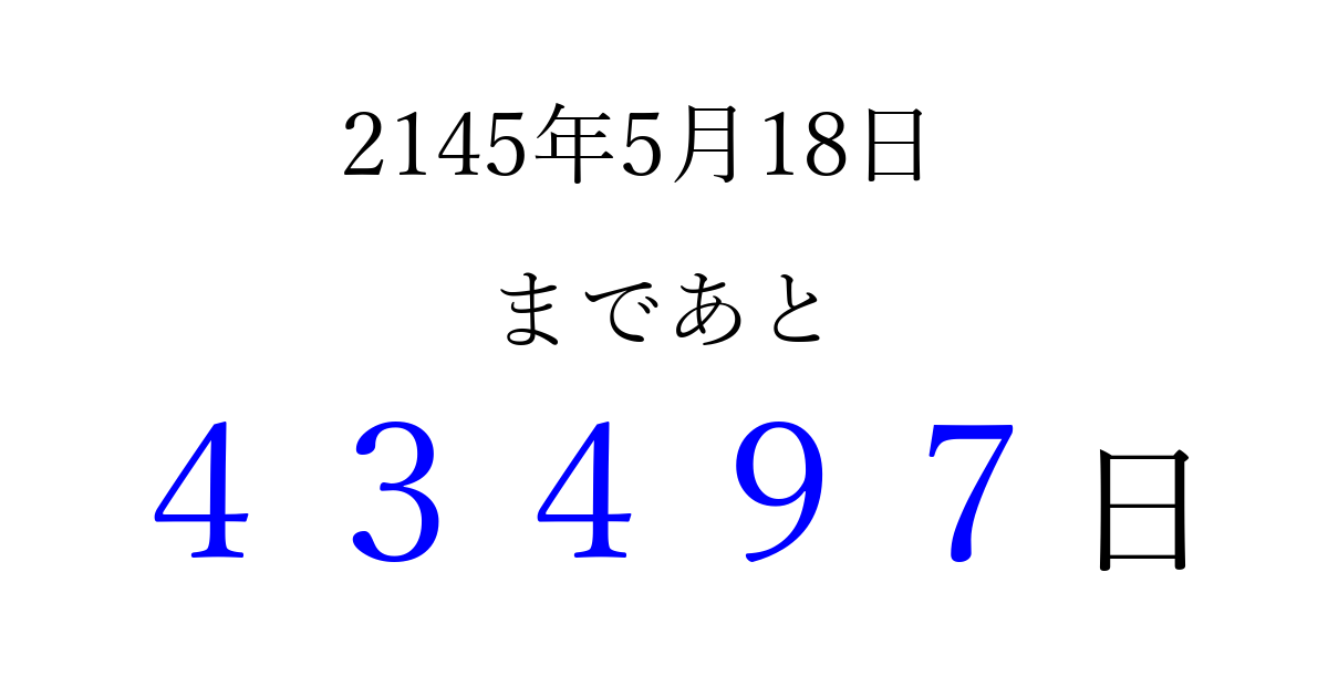 2145年5月18日(火)まで あと 99999 日です 追加すると、トップページからすぐ選べるようになります ※2026/04/15現在の結果です。 最新の状態に更新する ↓シェアして、タイムライン上にカウントダウンを表示しよう!↓ 📤 この結果を共有する Tweet シェア Threads Bluesky 別の日付でカウントダウン 2145年5月のカレンダー このページをブックマークに追加すると、いつでもカウントダウンを確認できます。 (PC: Ctrl+D / Mac: ⌘+D) hitome-notes.comでは以下のページも運営しています。 指定日と期間から日付を計算 | ガチャ確率計算・シミュレーション | プライバシー・ポリシー 運営者:Avocado