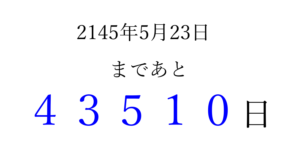 2145年5月23日(日)まで あと 99999 日です 追加すると、トップページからすぐ選べるようになります ※2026/04/07現在の結果です。 最新の状態に更新する ↓シェアして、タイムライン上にカウントダウンを表示しよう!↓ 📤 この結果を共有する Tweet シェア Threads Bluesky 別の日付でカウントダウン 2145年5月のカレンダー このページをブックマークに追加すると、いつでもカウントダウンを確認できます。 (PC: Ctrl+D / Mac: ⌘+D) hitome-notes.comでは以下のページも運営しています。 指定日と期間から日付を計算 | ガチャ確率計算・シミュレーション | プライバシー・ポリシー 運営者:Avocado