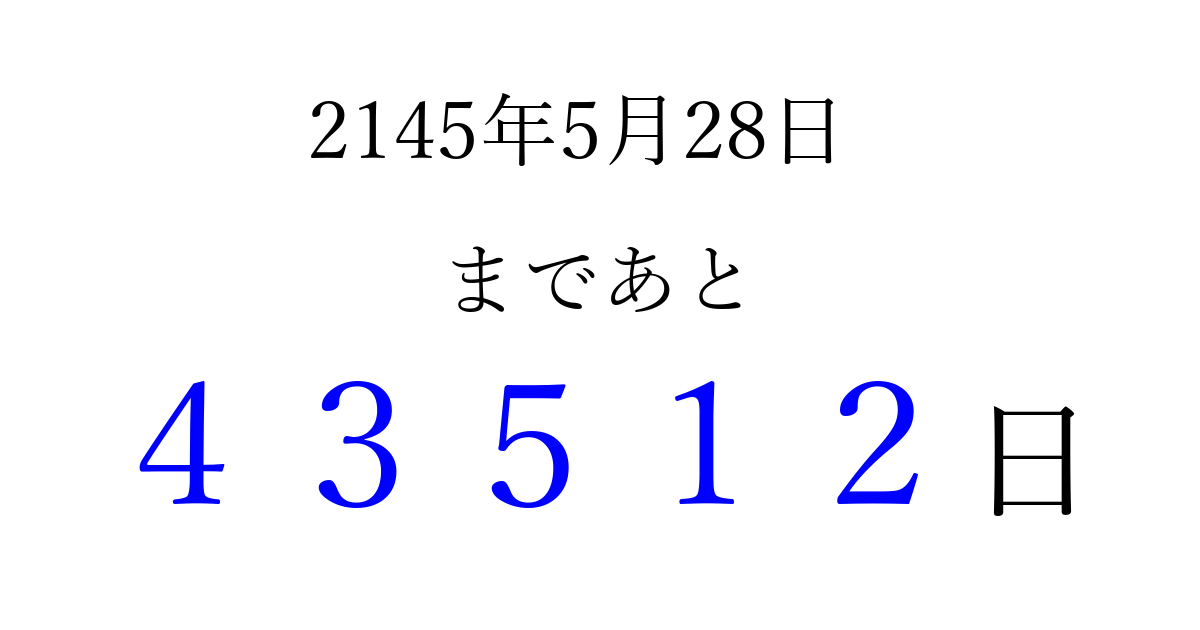 2145年5月28日(金)まで あと 99999 日です 追加すると、トップページからすぐ選べるようになります ※2026/04/10現在の結果です。 最新の状態に更新する ↓シェアして、タイムライン上にカウントダウンを表示しよう!↓ 📤 この結果を共有する Tweet シェア Threads Bluesky 別の日付でカウントダウン 2145年5月のカレンダー このページをブックマークに追加すると、いつでもカウントダウンを確認できます。 (PC: Ctrl+D / Mac: ⌘+D) hitome-notes.comでは以下のページも運営しています。 指定日と期間から日付を計算 | ガチャ確率計算・シミュレーション | プライバシー・ポリシー 運営者:Avocado