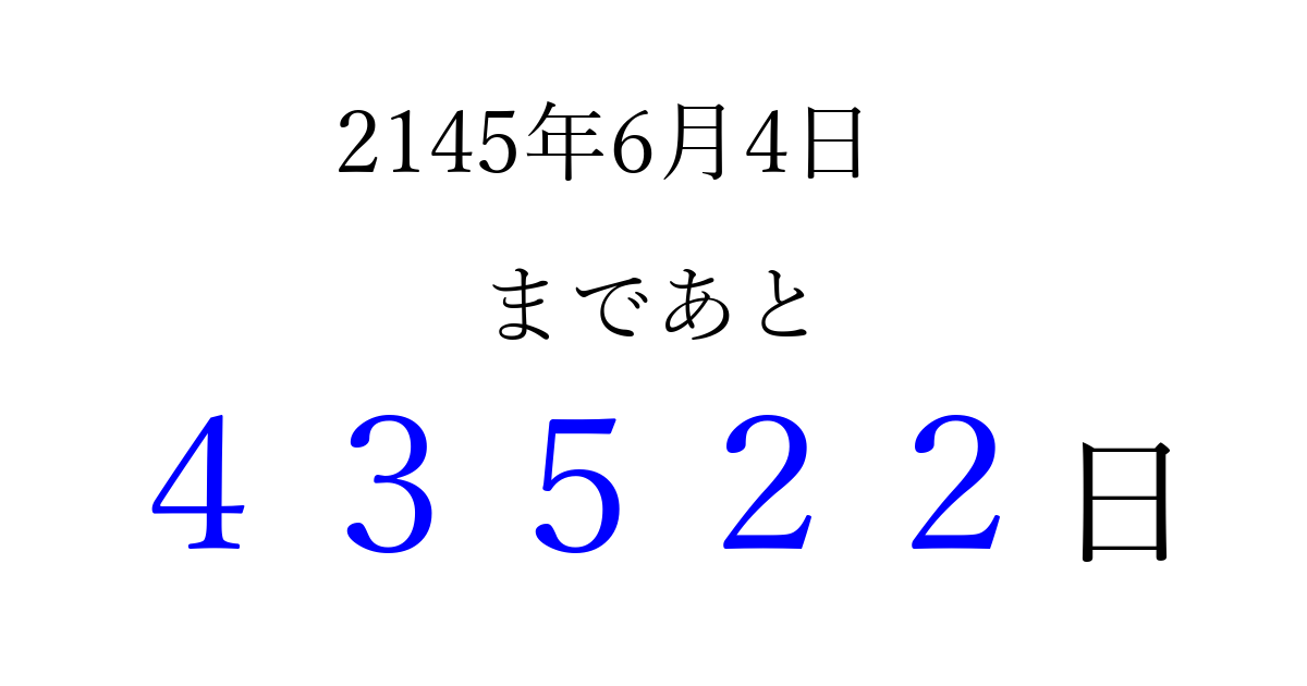 2145年6月4日(金)まで あと 99999 日です 追加すると、トップページからすぐ選べるようになります ※2026/04/07現在の結果です。 最新の状態に更新する ↓シェアして、タイムライン上にカウントダウンを表示しよう!↓ 📤 この結果を共有する Tweet シェア Threads Bluesky 別の日付でカウントダウン 2145年6月のカレンダー このページをブックマークに追加すると、いつでもカウントダウンを確認できます。 (PC: Ctrl+D / Mac: ⌘+D) hitome-notes.comでは以下のページも運営しています。 指定日と期間から日付を計算 | ガチャ確率計算・シミュレーション | プライバシー・ポリシー 運営者:Avocado