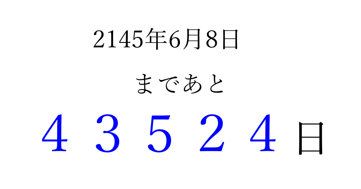 2145年6月8日(火)まで あと 99999 日です 追加すると、トップページからすぐ選べるようになります ※2026/04/09現在の結果です。 最新の状態に更新する ↓シェアして、タイムライン上にカウントダウンを表示しよう!↓ 📤 この結果を共有する Tweet シェア Threads Bluesky 別の日付でカウントダウン 2145年6月のカレンダー このページをブックマークに追加すると、いつでもカウントダウンを確認できます。 (PC: Ctrl+D / Mac: ⌘+D) hitome-notes.comでは以下のページも運営しています。 指定日と期間から日付を計算 | ガチャ確率計算・シミュレーション | プライバシー・ポリシー 運営者:Avocado