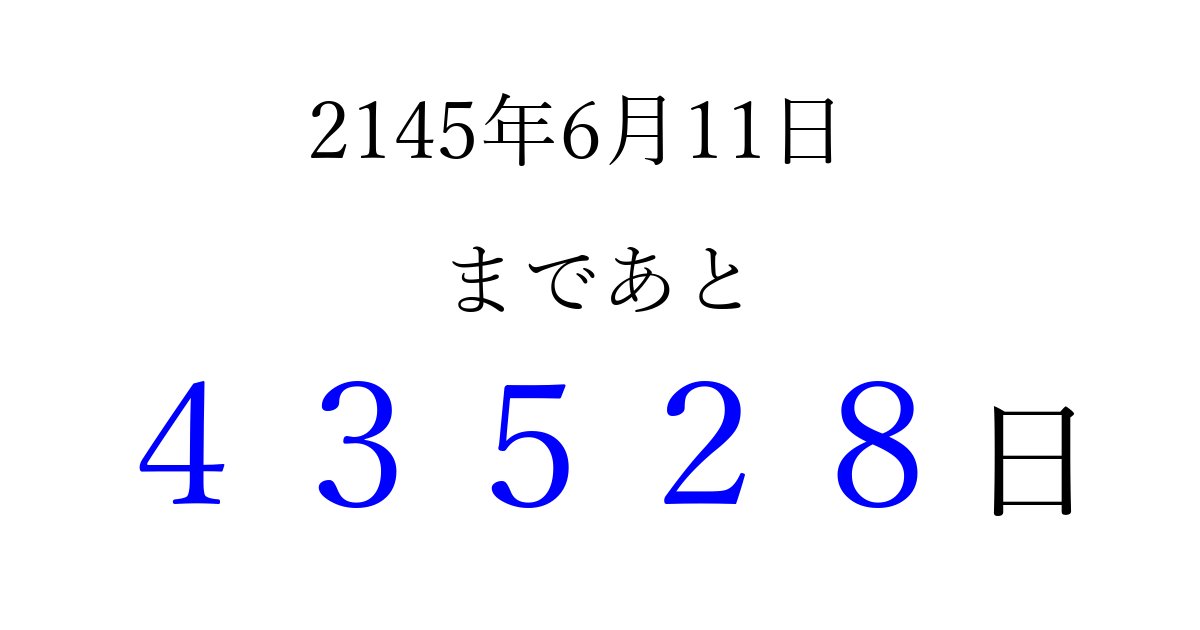 2145年6月11日(金)まで あと 99999 日です 追加すると、トップページからすぐ選べるようになります ※2026/04/08現在の結果です。 最新の状態に更新する ↓シェアして、タイムライン上にカウントダウンを表示しよう!↓ 📤 この結果を共有する Tweet シェア Threads Bluesky 別の日付でカウントダウン 2145年6月のカレンダー このページをブックマークに追加すると、いつでもカウントダウンを確認できます。 (PC: Ctrl+D / Mac: ⌘+D) hitome-notes.comでは以下のページも運営しています。 指定日と期間から日付を計算 | ガチャ確率計算・シミュレーション | プライバシー・ポリシー 運営者:Avocado