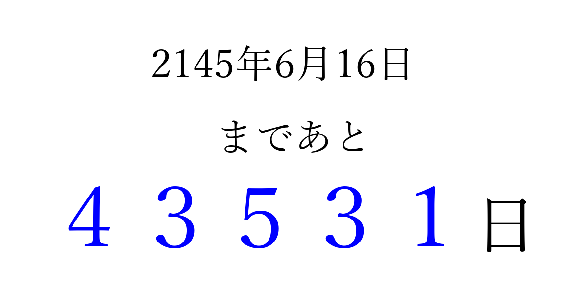 2145年6月16日(水)まで あと 99999 日です 追加すると、トップページからすぐ選べるようになります ※2026/04/10現在の結果です。 最新の状態に更新する ↓シェアして、タイムライン上にカウントダウンを表示しよう!↓ 📤 この結果を共有する Tweet シェア Threads Bluesky 別の日付でカウントダウン 2145年6月のカレンダー このページをブックマークに追加すると、いつでもカウントダウンを確認できます。 (PC: Ctrl+D / Mac: ⌘+D) hitome-notes.comでは以下のページも運営しています。 指定日と期間から日付を計算 | ガチャ確率計算・シミュレーション | プライバシー・ポリシー 運営者:Avocado