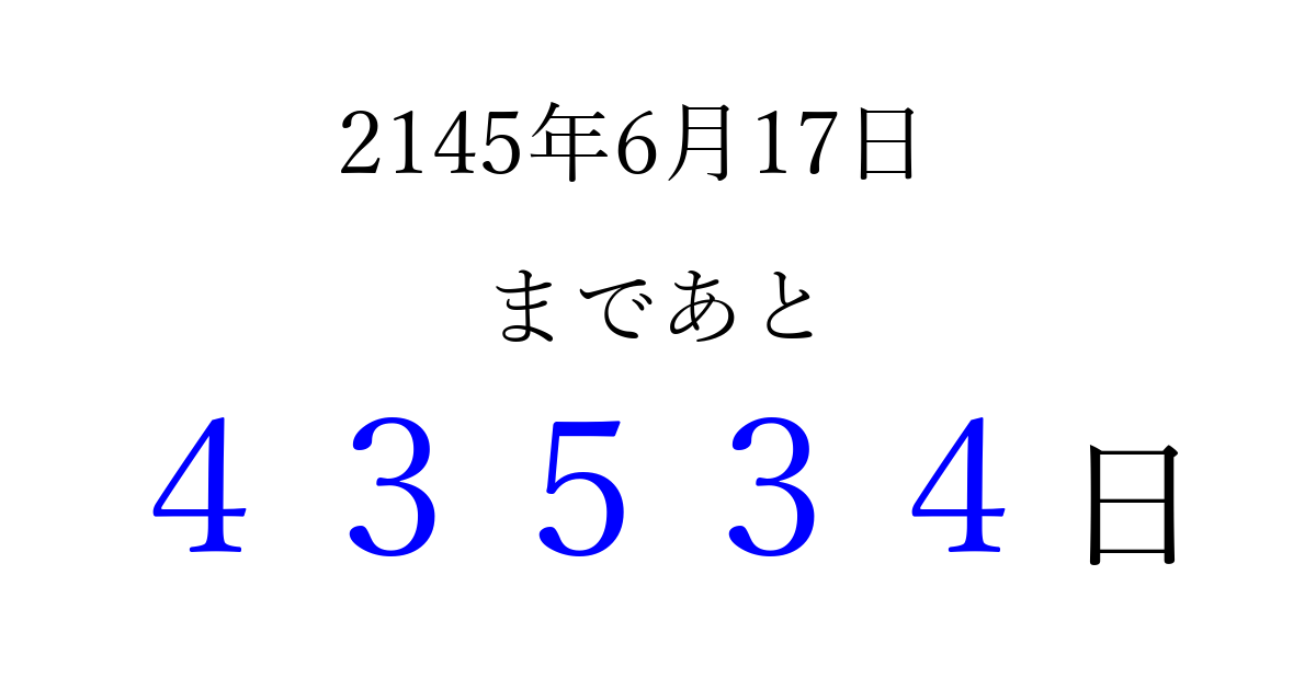 2145年6月17日(木)まで あと 99999 日です 追加すると、トップページからすぐ選べるようになります ※2026/04/08現在の結果です。 最新の状態に更新する ↓シェアして、タイムライン上にカウントダウンを表示しよう!↓ 📤 この結果を共有する Tweet シェア Threads Bluesky 別の日付でカウントダウン 2145年6月のカレンダー このページをブックマークに追加すると、いつでもカウントダウンを確認できます。 (PC: Ctrl+D / Mac: ⌘+D) hitome-notes.comでは以下のページも運営しています。 指定日と期間から日付を計算 | ガチャ確率計算・シミュレーション | プライバシー・ポリシー 運営者:Avocado