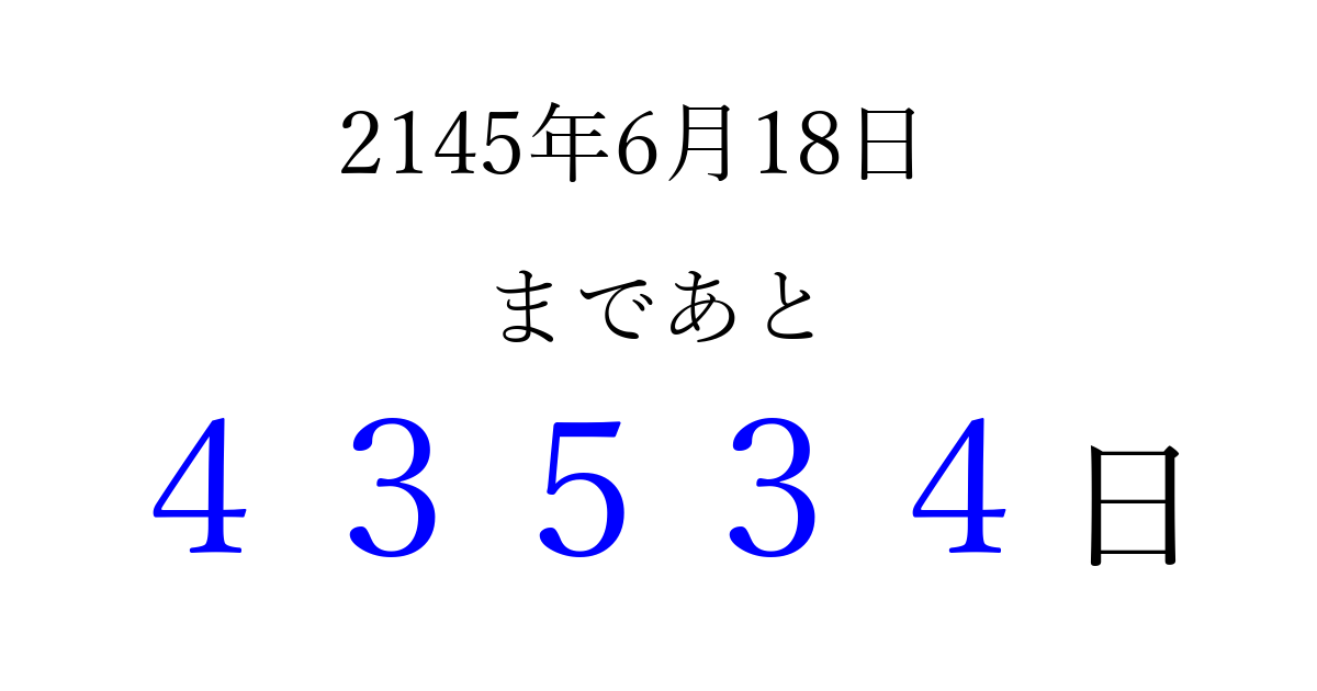 2145年6月18日(金)まで あと 99999 日です 追加すると、トップページからすぐ選べるようになります ※2026/04/09現在の結果です。 最新の状態に更新する ↓シェアして、タイムライン上にカウントダウンを表示しよう!↓ 📤 この結果を共有する Tweet シェア Threads Bluesky 別の日付でカウントダウン 2145年6月のカレンダー このページをブックマークに追加すると、いつでもカウントダウンを確認できます。 (PC: Ctrl+D / Mac: ⌘+D) hitome-notes.comでは以下のページも運営しています。 指定日と期間から日付を計算 | ガチャ確率計算・シミュレーション | プライバシー・ポリシー 運営者:Avocado