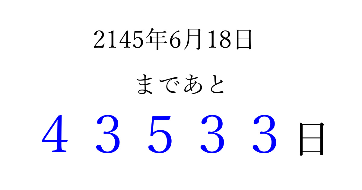 2145年6月18日(金)まで あと 99999 日です 追加すると、トップページからすぐ選べるようになります ※2026/04/10現在の結果です。 最新の状態に更新する ↓シェアして、タイムライン上にカウントダウンを表示しよう!↓ 📤 この結果を共有する Tweet シェア Threads Bluesky 別の日付でカウントダウン 2145年6月のカレンダー このページをブックマークに追加すると、いつでもカウントダウンを確認できます。 (PC: Ctrl+D / Mac: ⌘+D) hitome-notes.comでは以下のページも運営しています。 指定日と期間から日付を計算 | ガチャ確率計算・シミュレーション | プライバシー・ポリシー 運営者:Avocado
