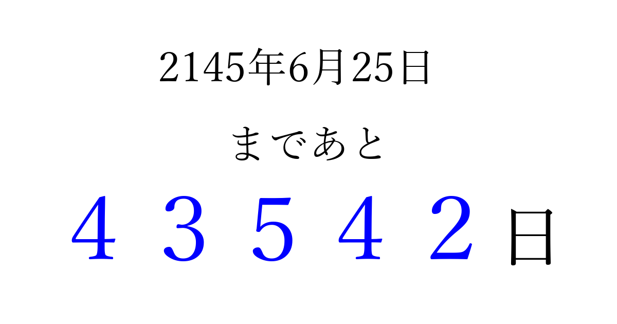 2145年6月25日(金)まで あと 99999 日です 追加すると、トップページからすぐ選べるようになります ※2026/04/08現在の結果です。 最新の状態に更新する ↓シェアして、タイムライン上にカウントダウンを表示しよう!↓ 📤 この結果を共有する Tweet シェア Threads Bluesky 別の日付でカウントダウン 2145年6月のカレンダー このページをブックマークに追加すると、いつでもカウントダウンを確認できます。 (PC: Ctrl+D / Mac: ⌘+D) hitome-notes.comでは以下のページも運営しています。 指定日と期間から日付を計算 | ガチャ確率計算・シミュレーション | プライバシー・ポリシー 運営者:Avocado