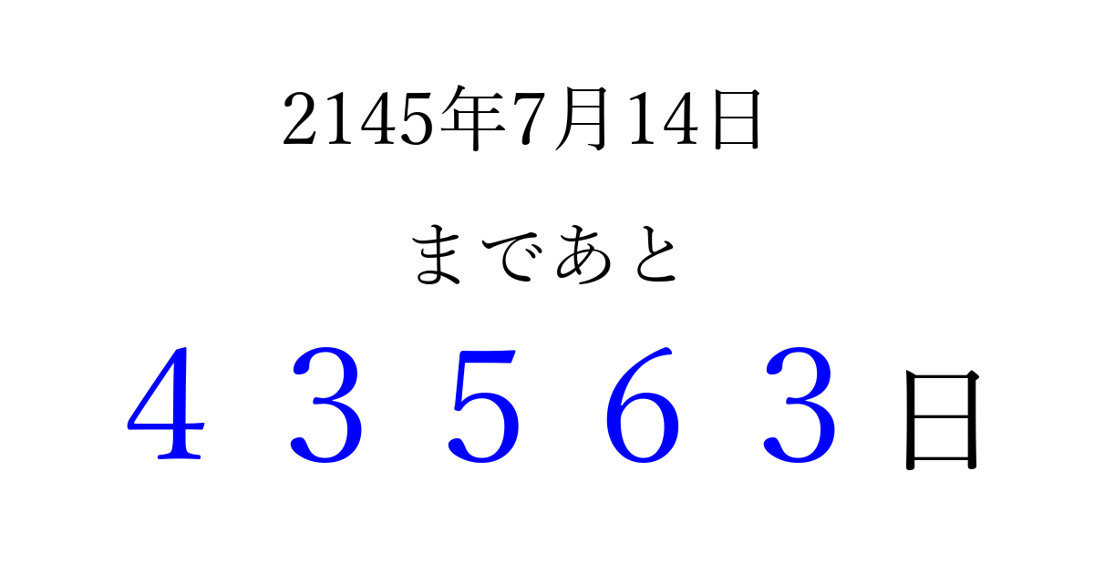 2145年7月14日(水)まで あと 99999 日です 追加すると、トップページからすぐ選べるようになります ※2026/04/06現在の結果です。 最新の状態に更新する ↓シェアして、タイムライン上にカウントダウンを表示しよう!↓ 📤 この結果を共有する Tweet シェア Threads Bluesky 別の日付でカウントダウン 2145年7月のカレンダー このページをブックマークに追加すると、いつでもカウントダウンを確認できます。 (PC: Ctrl+D / Mac: ⌘+D) hitome-notes.comでは以下のページも運営しています。 指定日と期間から日付を計算 | ガチャ確率計算・シミュレーション | プライバシー・ポリシー 運営者:Avocado