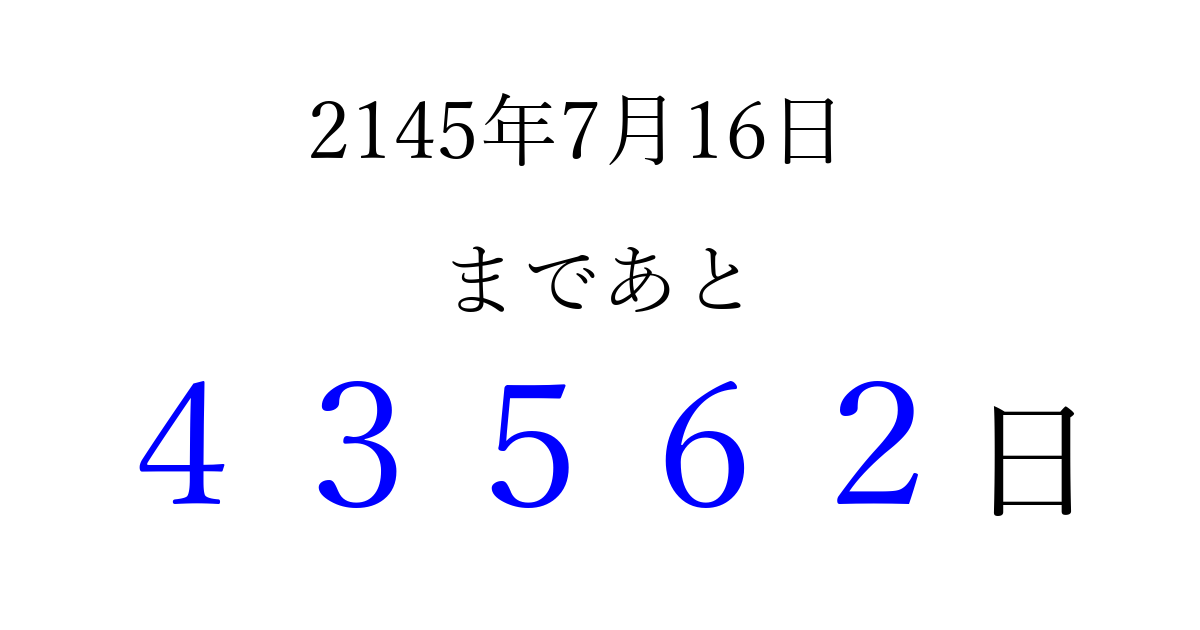 2145年7月16日(金)まで あと 99999 日です 追加すると、トップページからすぐ選べるようになります ※2026/04/09現在の結果です。 最新の状態に更新する ↓シェアして、タイムライン上にカウントダウンを表示しよう!↓ 📤 この結果を共有する Tweet シェア Threads Bluesky 別の日付でカウントダウン 2145年7月のカレンダー このページをブックマークに追加すると、いつでもカウントダウンを確認できます。 (PC: Ctrl+D / Mac: ⌘+D) hitome-notes.comでは以下のページも運営しています。 指定日と期間から日付を計算 | ガチャ確率計算・シミュレーション | プライバシー・ポリシー 運営者:Avocado