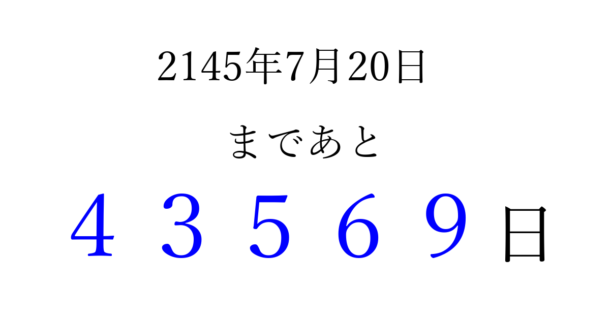 2145年7月20日(火)まで あと 99999 日です 追加すると、トップページからすぐ選べるようになります ※2026/04/06現在の結果です。 最新の状態に更新する ↓シェアして、タイムライン上にカウントダウンを表示しよう!↓ 📤 この結果を共有する Tweet シェア Threads Bluesky 別の日付でカウントダウン 2145年7月のカレンダー このページをブックマークに追加すると、いつでもカウントダウンを確認できます。 (PC: Ctrl+D / Mac: ⌘+D) hitome-notes.comでは以下のページも運営しています。 指定日と期間から日付を計算 | ガチャ確率計算・シミュレーション | プライバシー・ポリシー 運営者:Avocado