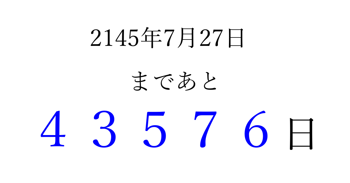 2145年7月27日(火)まで あと 99999 日です 追加すると、トップページからすぐ選べるようになります ※2026/04/06現在の結果です。 最新の状態に更新する ↓シェアして、タイムライン上にカウントダウンを表示しよう!↓ 📤 この結果を共有する Tweet シェア Threads Bluesky 別の日付でカウントダウン 2145年7月のカレンダー このページをブックマークに追加すると、いつでもカウントダウンを確認できます。 (PC: Ctrl+D / Mac: ⌘+D) hitome-notes.comでは以下のページも運営しています。 指定日と期間から日付を計算 | ガチャ確率計算・シミュレーション | プライバシー・ポリシー 運営者:Avocado