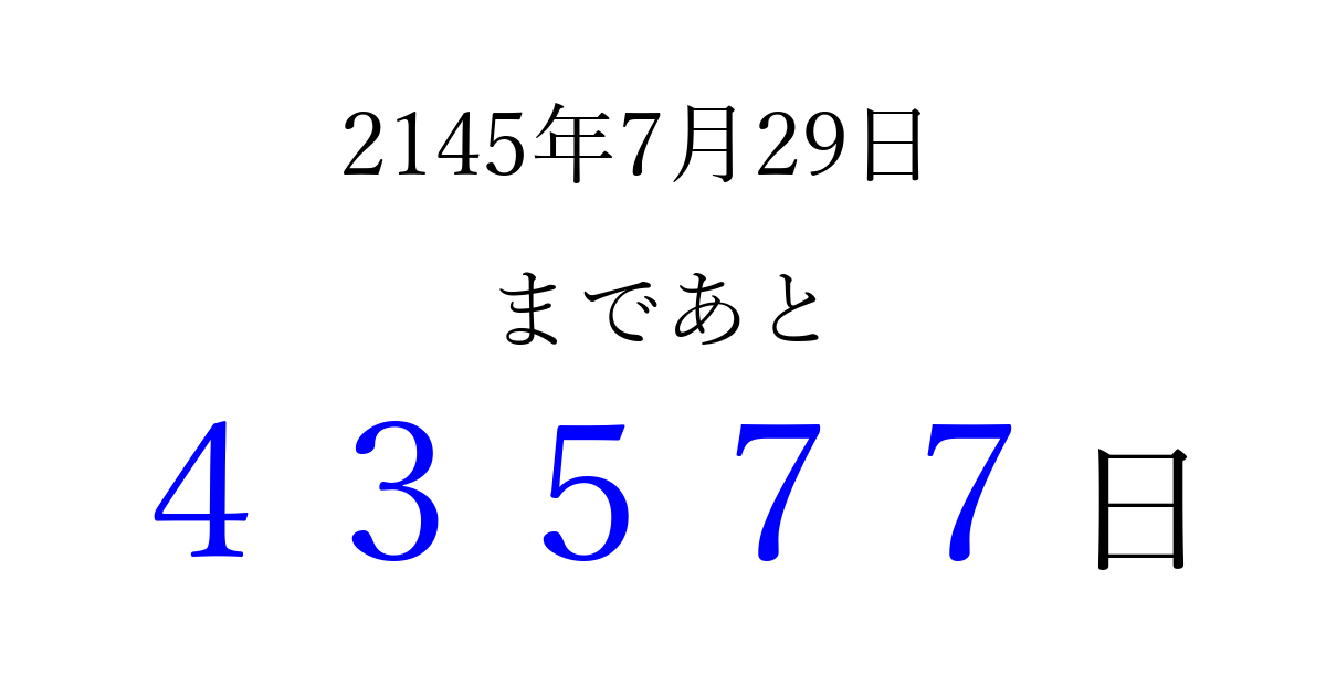 2145年7月29日(木)まで あと 99999 日です 追加すると、トップページからすぐ選べるようになります ※2026/04/07現在の結果です。 最新の状態に更新する ↓シェアして、タイムライン上にカウントダウンを表示しよう!↓ 📤 この結果を共有する Tweet シェア Threads Bluesky 別の日付でカウントダウン 2145年7月のカレンダー このページをブックマークに追加すると、いつでもカウントダウンを確認できます。 (PC: Ctrl+D / Mac: ⌘+D) hitome-notes.comでは以下のページも運営しています。 指定日と期間から日付を計算 | ガチャ確率計算・シミュレーション | プライバシー・ポリシー 運営者:Avocado