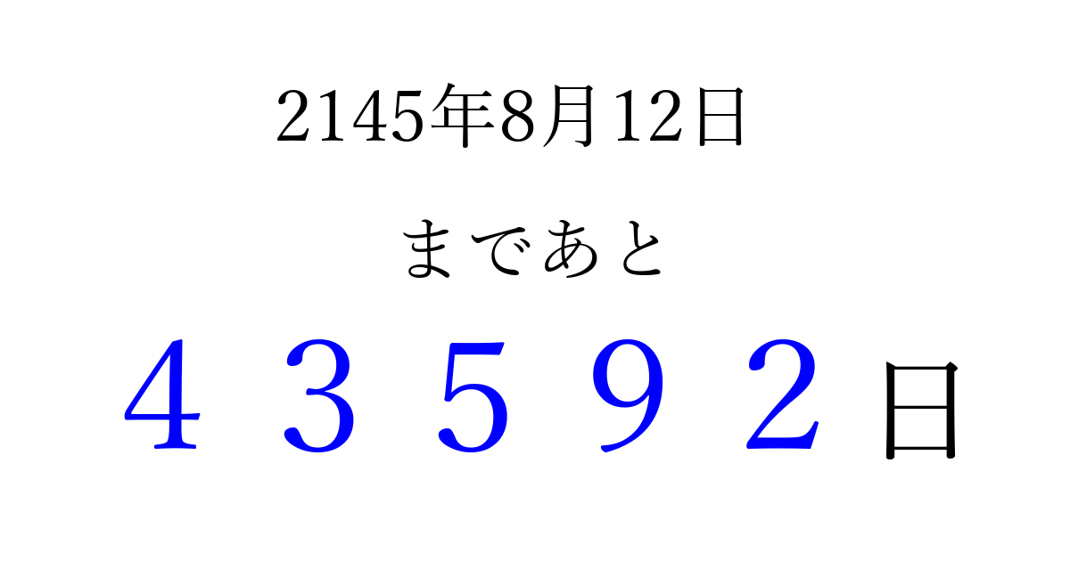 2145年8月12日(木)まで あと 99999 日です 追加すると、トップページからすぐ選べるようになります ※2026/04/06現在の結果です。 最新の状態に更新する ↓シェアして、タイムライン上にカウントダウンを表示しよう!↓ 📤 この結果を共有する Tweet シェア Threads Bluesky 別の日付でカウントダウン 2145年8月のカレンダー このページをブックマークに追加すると、いつでもカウントダウンを確認できます。 (PC: Ctrl+D / Mac: ⌘+D) hitome-notes.comでは以下のページも運営しています。 指定日と期間から日付を計算 | ガチャ確率計算・シミュレーション | プライバシー・ポリシー 運営者:Avocado