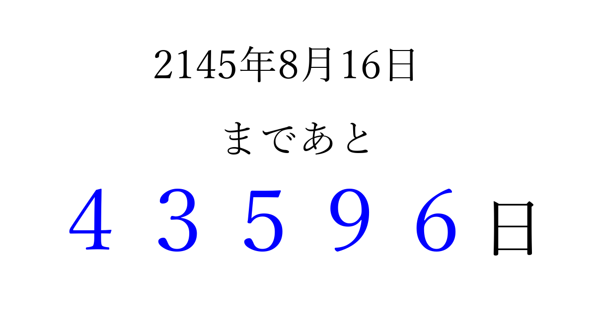 2145年8月16日(月)まで あと 99999 日です 追加すると、トップページからすぐ選べるようになります ※2026/04/06現在の結果です。 最新の状態に更新する ↓シェアして、タイムライン上にカウントダウンを表示しよう!↓ 📤 この結果を共有する Tweet シェア Threads Bluesky 別の日付でカウントダウン 2145年8月のカレンダー このページをブックマークに追加すると、いつでもカウントダウンを確認できます。 (PC: Ctrl+D / Mac: ⌘+D) hitome-notes.comでは以下のページも運営しています。 指定日と期間から日付を計算 | ガチャ確率計算・シミュレーション | プライバシー・ポリシー 運営者:Avocado
