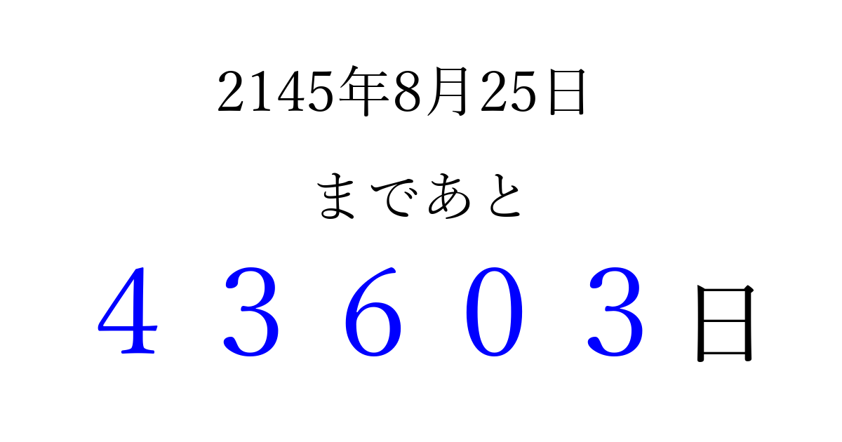 2145年8月25日(水)まで あと 99999 日です 追加すると、トップページからすぐ選べるようになります ※2026/04/08現在の結果です。 最新の状態に更新する ↓シェアして、タイムライン上にカウントダウンを表示しよう!↓ 📤 この結果を共有する Tweet シェア Threads Bluesky 別の日付でカウントダウン 2145年8月のカレンダー このページをブックマークに追加すると、いつでもカウントダウンを確認できます。 (PC: Ctrl+D / Mac: ⌘+D) hitome-notes.comでは以下のページも運営しています。 指定日と期間から日付を計算 | ガチャ確率計算・シミュレーション | プライバシー・ポリシー 運営者:Avocado