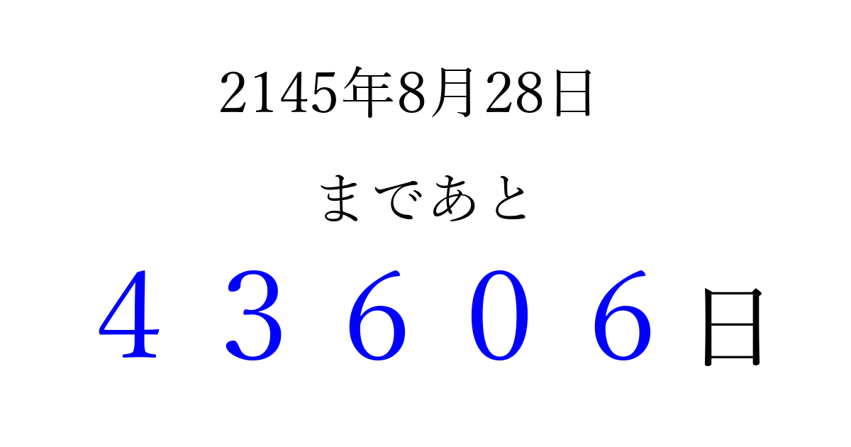 2145年8月28日(土)まで あと 99999 日です 追加すると、トップページからすぐ選べるようになります ※2026/04/08現在の結果です。 最新の状態に更新する ↓シェアして、タイムライン上にカウントダウンを表示しよう!↓ 📤 この結果を共有する Tweet シェア Threads Bluesky 別の日付でカウントダウン 2145年8月のカレンダー このページをブックマークに追加すると、いつでもカウントダウンを確認できます。 (PC: Ctrl+D / Mac: ⌘+D) hitome-notes.comでは以下のページも運営しています。 指定日と期間から日付を計算 | ガチャ確率計算・シミュレーション | プライバシー・ポリシー 運営者:Avocado