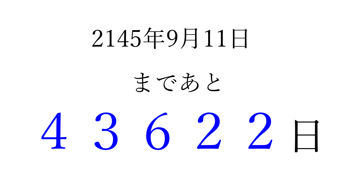 2145年9月11日(土)まで あと 99999 日です 追加すると、トップページからすぐ選べるようになります ※2026/04/06現在の結果です。 最新の状態に更新する ↓シェアして、タイムライン上にカウントダウンを表示しよう!↓ 📤 この結果を共有する Tweet シェア Threads Bluesky 別の日付でカウントダウン 2145年9月のカレンダー このページをブックマークに追加すると、いつでもカウントダウンを確認できます。 (PC: Ctrl+D / Mac: ⌘+D) hitome-notes.comでは以下のページも運営しています。 指定日と期間から日付を計算 | ガチャ確率計算・シミュレーション | プライバシー・ポリシー 運営者:Avocado