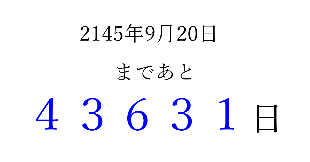 2145年9月20日(月)まで あと 99999 日です 追加すると、トップページからすぐ選べるようになります ※2026/04/06現在の結果です。 最新の状態に更新する ↓シェアして、タイムライン上にカウントダウンを表示しよう!↓ 📤 この結果を共有する Tweet シェア Threads Bluesky 別の日付でカウントダウン 2145年9月のカレンダー このページをブックマークに追加すると、いつでもカウントダウンを確認できます。 (PC: Ctrl+D / Mac: ⌘+D) hitome-notes.comでは以下のページも運営しています。 指定日と期間から日付を計算 | ガチャ確率計算・シミュレーション | プライバシー・ポリシー 運営者:Avocado