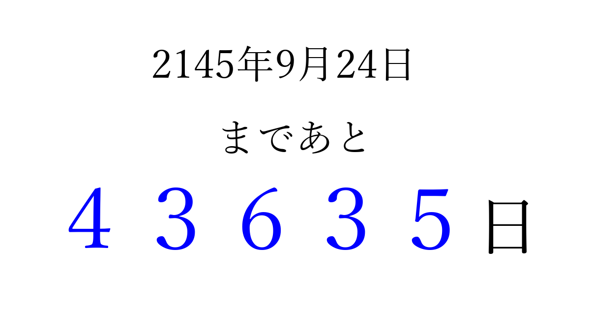 2145年9月24日(金)まで あと 99999 日です 追加すると、トップページからすぐ選べるようになります ※2026/04/06現在の結果です。 最新の状態に更新する ↓シェアして、タイムライン上にカウントダウンを表示しよう!↓ 📤 この結果を共有する Tweet シェア Threads Bluesky 別の日付でカウントダウン 2145年9月のカレンダー このページをブックマークに追加すると、いつでもカウントダウンを確認できます。 (PC: Ctrl+D / Mac: ⌘+D) hitome-notes.comでは以下のページも運営しています。 指定日と期間から日付を計算 | ガチャ確率計算・シミュレーション | プライバシー・ポリシー 運営者:Avocado