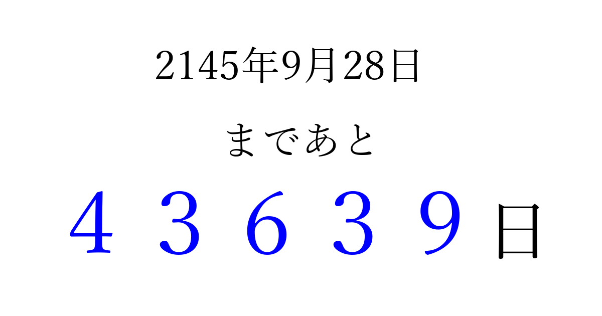 2145年9月28日(火)まで あと 99999 日です 追加すると、トップページからすぐ選べるようになります ※2026/04/06現在の結果です。 最新の状態に更新する ↓シェアして、タイムライン上にカウントダウンを表示しよう!↓ 📤 この結果を共有する Tweet シェア Threads Bluesky 別の日付でカウントダウン 2145年9月のカレンダー このページをブックマークに追加すると、いつでもカウントダウンを確認できます。 (PC: Ctrl+D / Mac: ⌘+D) hitome-notes.comでは以下のページも運営しています。 指定日と期間から日付を計算 | ガチャ確率計算・シミュレーション | プライバシー・ポリシー 運営者:Avocado