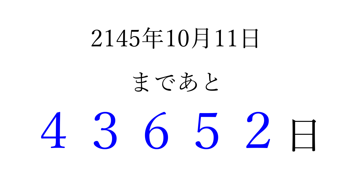 2145年10月11日(月)まで あと 99999 日です 追加すると、トップページからすぐ選べるようになります ※2026/04/06現在の結果です。 最新の状態に更新する ↓シェアして、タイムライン上にカウントダウンを表示しよう!↓ 📤 この結果を共有する Tweet シェア Threads Bluesky 別の日付でカウントダウン 2145年10月のカレンダー このページをブックマークに追加すると、いつでもカウントダウンを確認できます。 (PC: Ctrl+D / Mac: ⌘+D) hitome-notes.comでは以下のページも運営しています。 指定日と期間から日付を計算 | ガチャ確率計算・シミュレーション | プライバシー・ポリシー 運営者:Avocado